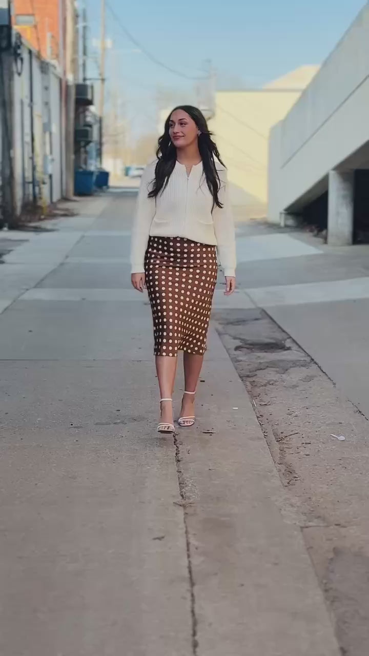This maxi skirt is really that girl. This brown and cream polka dot maxi skirt is giving so sweet. Featuring a satin smooth flowy fabric and an all over classic polka dot print. This beauty moves with you due to a nice thick elastic band in the waistline and lightweight satin material. The rich brown base paired with soft cream dots creates the perfect balance of neutral but fun, making it an easy piece to pair with any top.