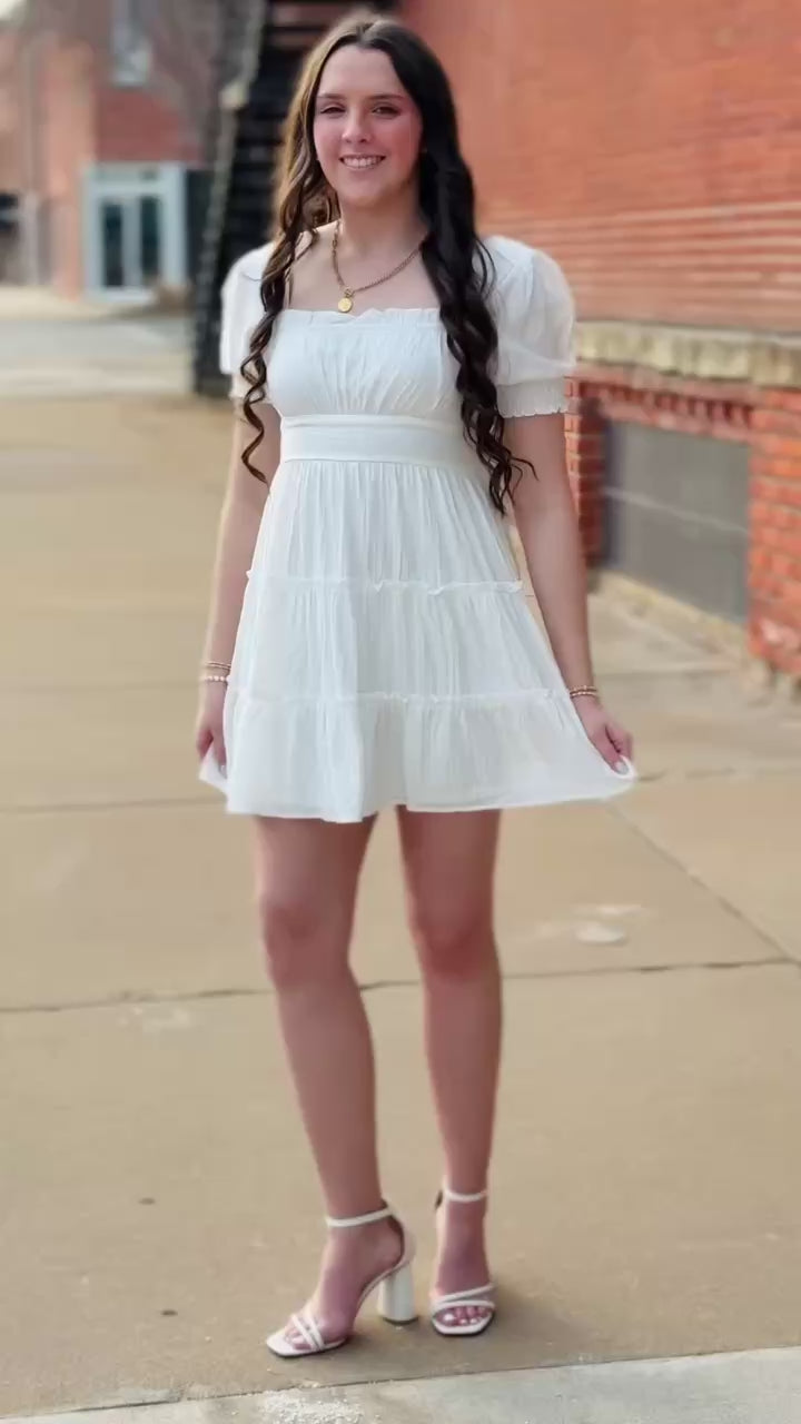 This white tiered mini is giving us all the trendy, girly summer vibes we’ve been dreaming of! Whether you’re smiling for graduation photos, posing for family beach portraits, or just want to feel a little extra dressy without being over the top, this dress is a must. We are swooning over the feminine square neckline and those precious smocked arm cuffs that add the perfect touch of texture. The tiered skirt with dainty ruffle details creates the most beautiful movement. The fabric offers a comfortable bit of stretch in the back for an easy fit. It’s light, airy, and just a classic white dress for what all the warm weather brings.