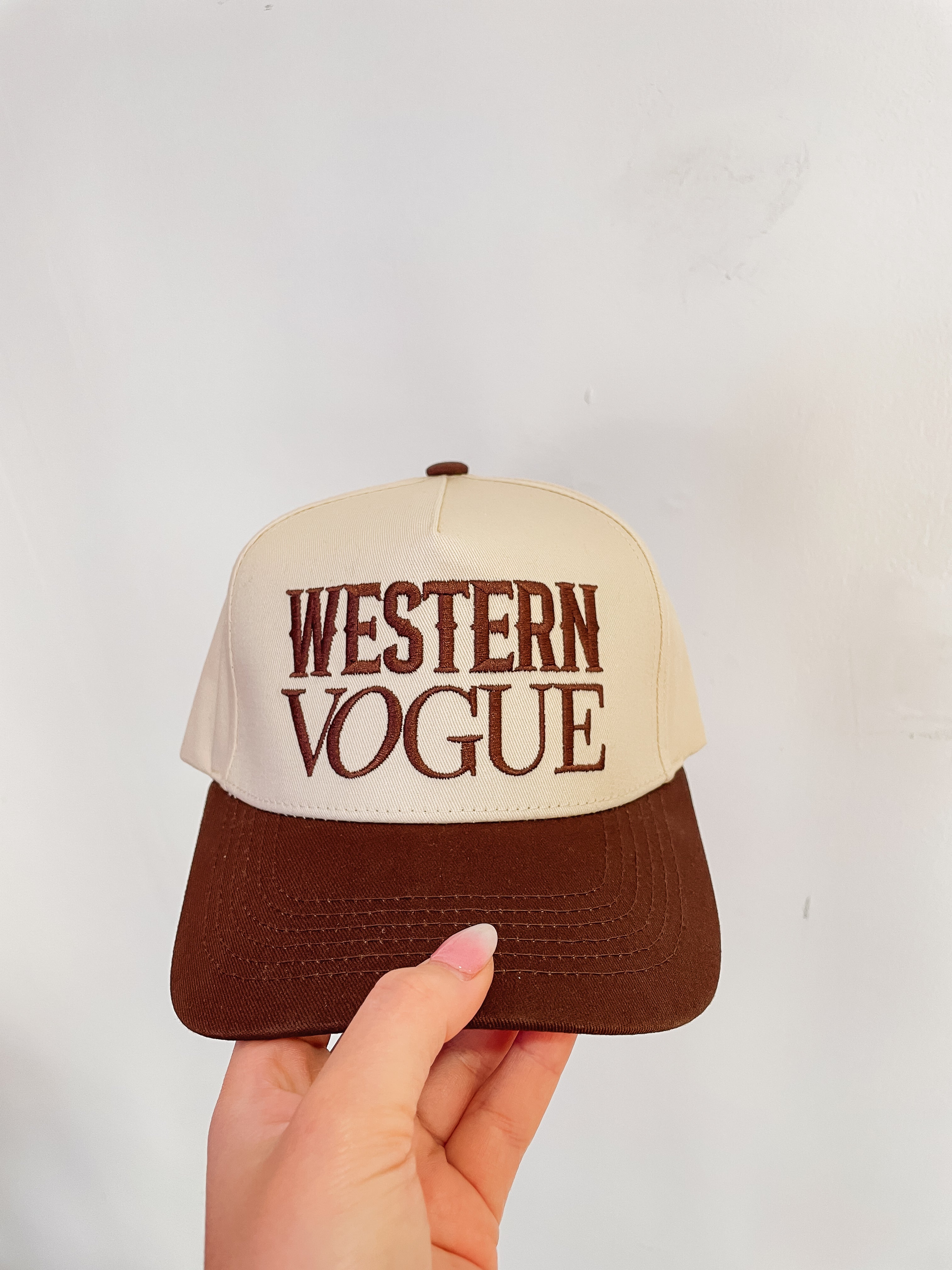 Cream and brown trucker with bold “Western Vogue” embroidery.