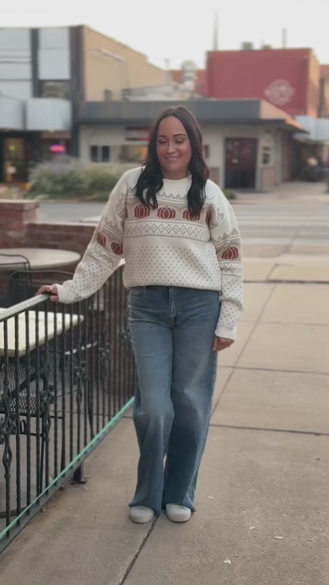 This sweater has us craving crisp fall mornings and the start of soup season. With its cream knit base and row of burnt orange pumpkins framed in classic fair isle-inspired patterns, it’s autumn wrapped in a sweater. Finished with a crew neckline, ribbed cuffs, and hem, it’s the kind of nostalgic seasonal piece you’ll look forward to pulling out year after year.