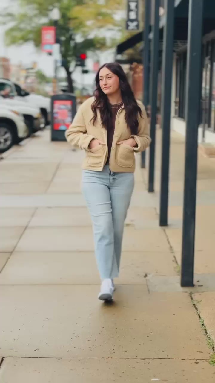 Soft, plush, and perfectly comfy. This sherpa jacket gives all the cozy feels with a touch of refined charm. The cropped waistline keeps it modern and flattering, while the rounded collar and oversized patch pockets bring that timeless, classic feel. Effortlessly stylish and endlessly wearable, it’s the kind of piece that looks just as good with vintage denim as it does over a slip dress. Cozy never looked so elevated.