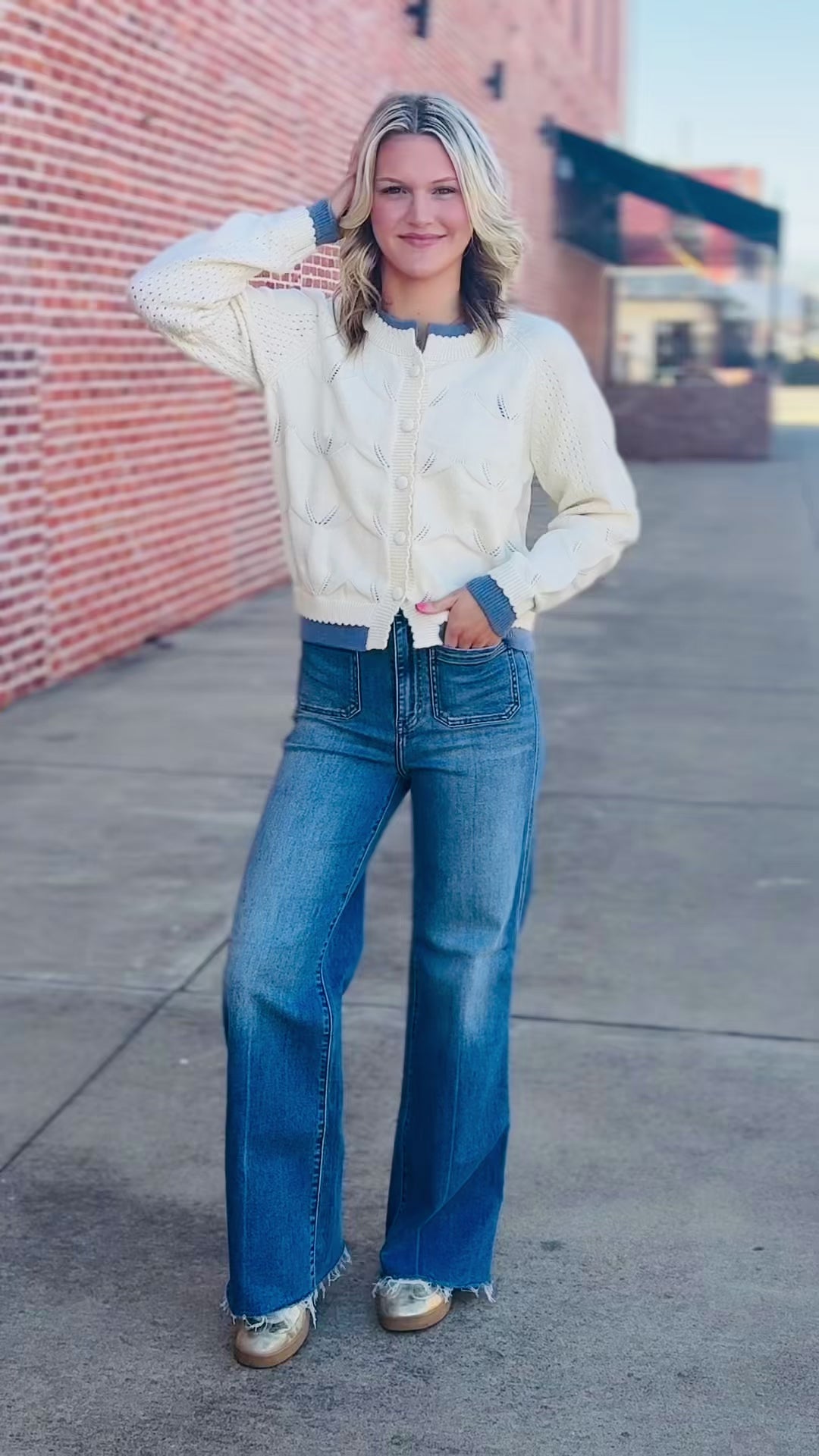 BRB, swooning over this cardigan. This faux layered cardigan serves up that polished, preppy look without any of the bulk or fuss of actual layering. The creamy, soft knit features a delicate leaf pattern that feels incredibly high end and heirloom quality. But the real showstopper is the pop of dusty blue at the neckline, cuffs, and hem, creating a fresh, contrasting border that makes it look like you have perfectly styled a coordinating top underneath. It is sweet, sophisticated, and undeniably chic, basically, spring in a sweater.
