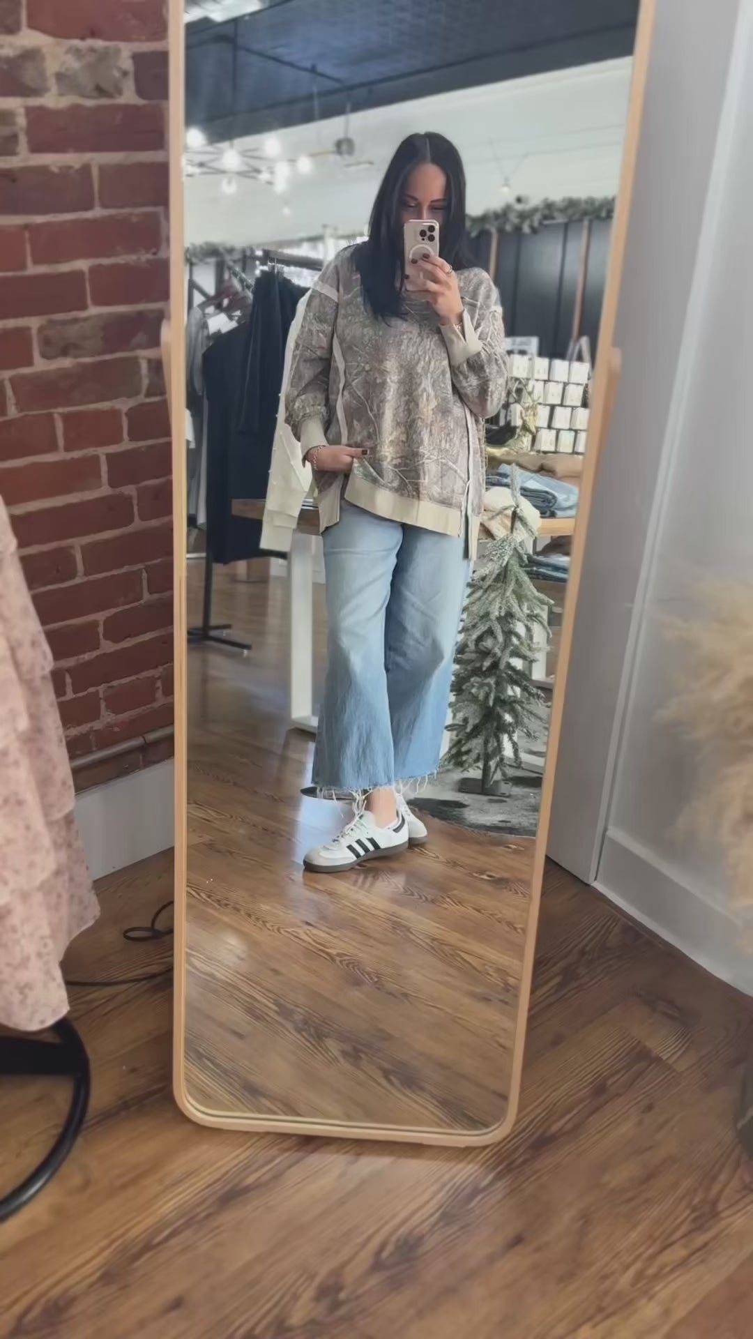 Y’all… this pullover understood the assignment. We’re talking that slouchy, “stole it from you man” fit with dropped shoulders and a scoop neckline that’s just easy. The exposed seams give it that cool, worn in vibe while the split cuffs keep it unique. The inside is a soft lightweight fleece, and with its camo print, she couldn’t be more perfect for fall.
