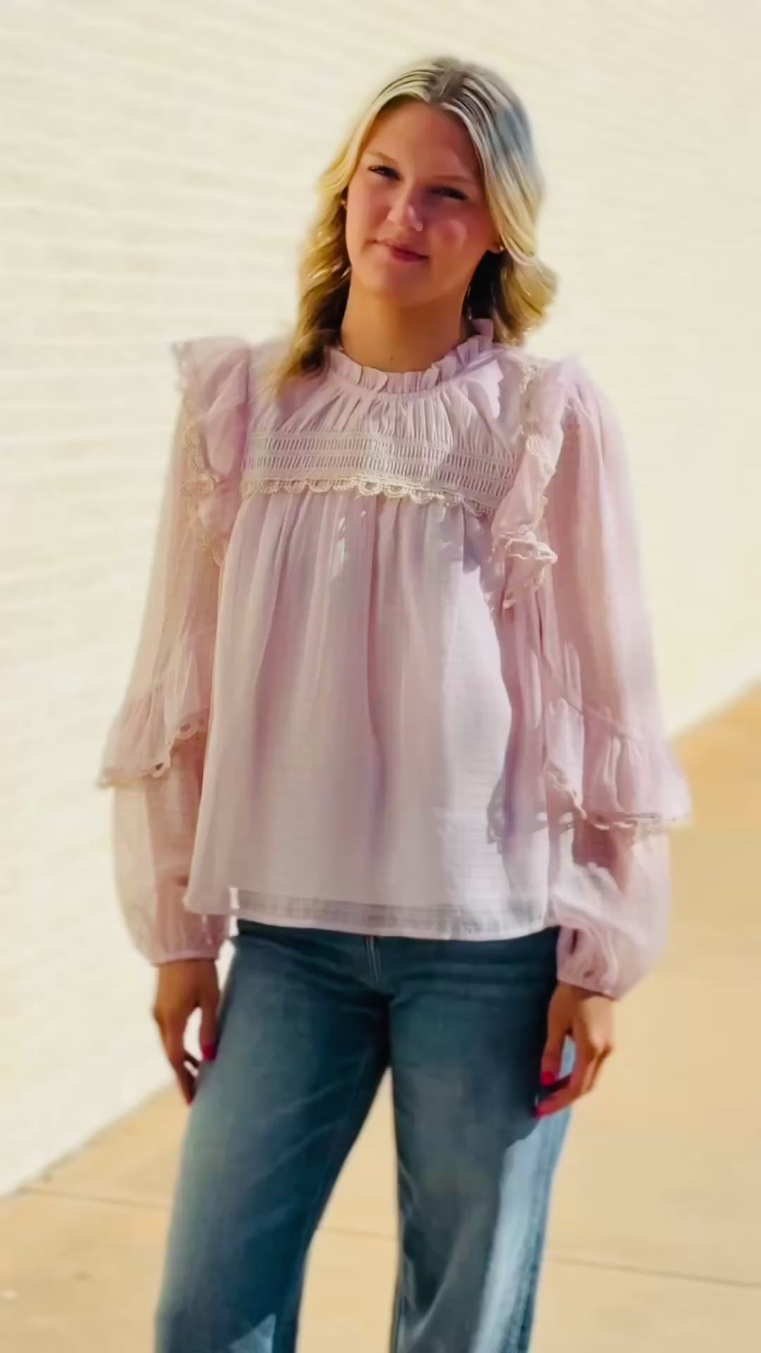 This blouse feels like springtime wrapped into the sweetest statement piece. Designed with a relaxed, true to size fit, this top features the most darling ruffled neckline that adds soft texture and a beautifully feminine frame around the face. The bodice showcases intricate detailing across the chest with delicate cream lace trim that adds vintage charm and thoughtful dimension. Flowing ruffle accents cascade along the shoulders and sleeves, creating a flouncy, airy silhouette that moves beautifully with you. The lightweight fabric keeps the blouse breathable and comfortable, while the soft pastel hue paired with the lace detailing gives it that picture perfect Easter and Sunday church feel. It’s graceful, playful, and filled with delicate touches that make it feel extra special.